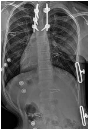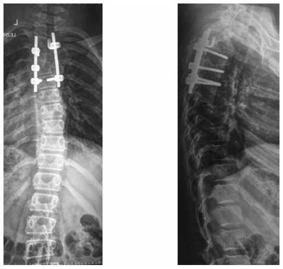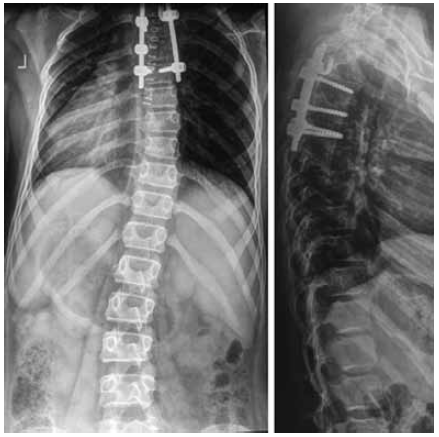 Рис. 2. Рентгенограммы позвоночника пациентки Ф., 11 лет, в двух проекциях после оперативного лечения