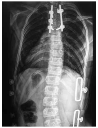 During the entire follow-up period, the patient was on a spinal support for 20 h a day, received courses of conservative treatment, and underwent periodic follow-up examinations. Ten months after the surgical treatment, follow-up examination revealed that a replacement of the spinal support was necessitated because the pediatric patient had grown by 7 cm. The pressure was strengthened by the orthosis bandages to achieve a better correction of residual curvature angles in the thoracic and lumbar regions. The patient did not have any complaint. Improvement in the appearance of the patient was clinically marked. There was a decrease in the size of the costal humpback in the thoracic region, the symmetrical arrangement of the shoulder girdle and the angles of the shoulder blades were evident, and pelvic distortion was solved. Nonetheless, the asymmetry of the waist triangles demonstrated only minimal improvement. A radiograph of the spine without spinal support, in standing and frontal view, was made. The position of the surgical hardware was reported to be radiologically stable and correct. There was no loss of the achieved correction, and the residual deformity arches in the thoracic and lumbar spine were corrected (Fig. 4).