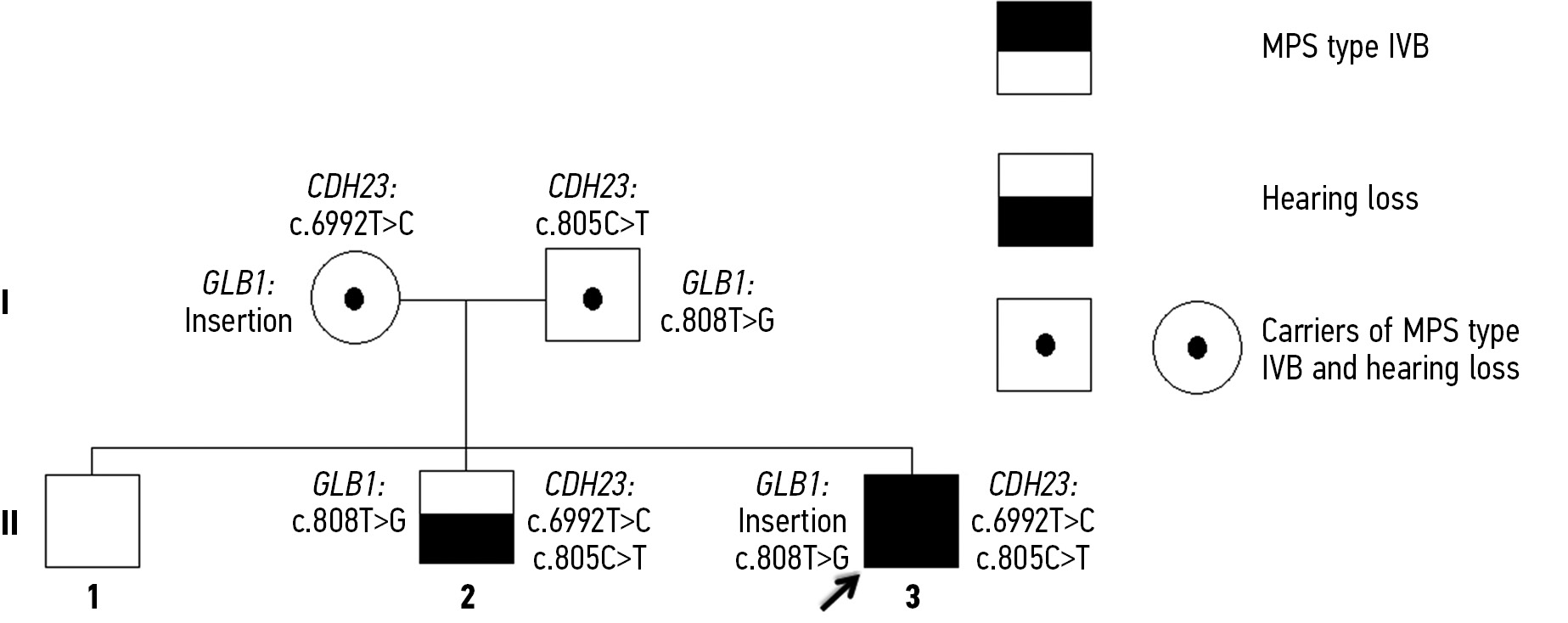 CONCLUSIONS: The uniqueness of this clinical case is the presence of the rare type of mucopolysaccharidos and the separate genetic cause of sensorineural hearing loss in a single patient. The diagnosis of mucopolysaccharidos IVB in the proband was confirmed by biochemical and molecular genetic tests, and the diagnosis of CDH23-associated sensorineural deafness in the proband and brother (born in 2009) was confirmed by molecular genetic testing.