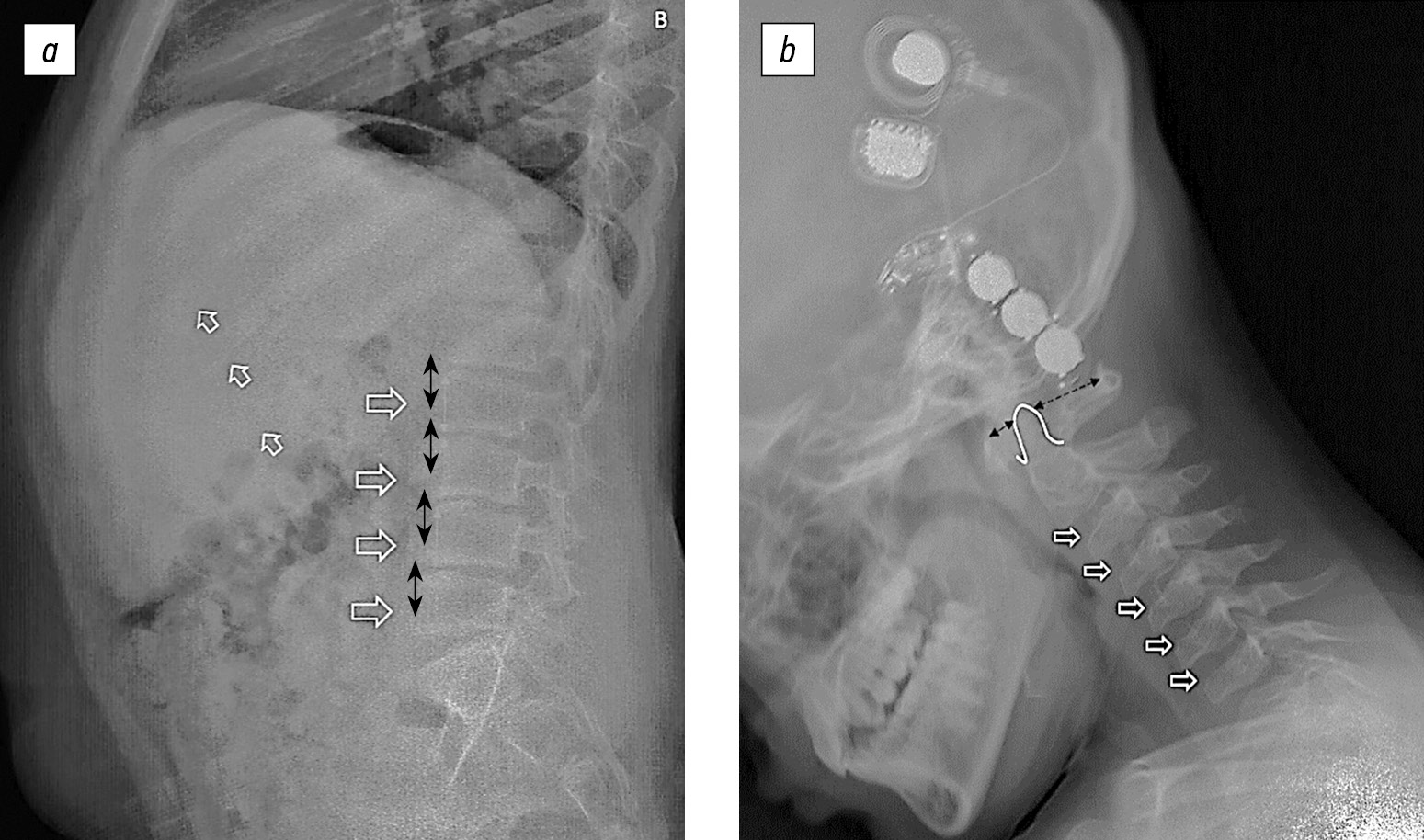 Fig. 2. Radiographs of the cervical and thoracic spine: a, white arrows indicate expansion of the intercostal spaces, paddle-like costal deformity, and deformity of the ventral vertebrae; blue-dotted line indicates anisospondylia with an uneven height of the vertebrae in the craniocaudal direction; b, white line indicates hypoplasia of the odontoid process of the second cervical vertebra, black arrows indicate signs of atlanto-axial instability, and white arrows indicate deformity of the ventral cervical vertebrae