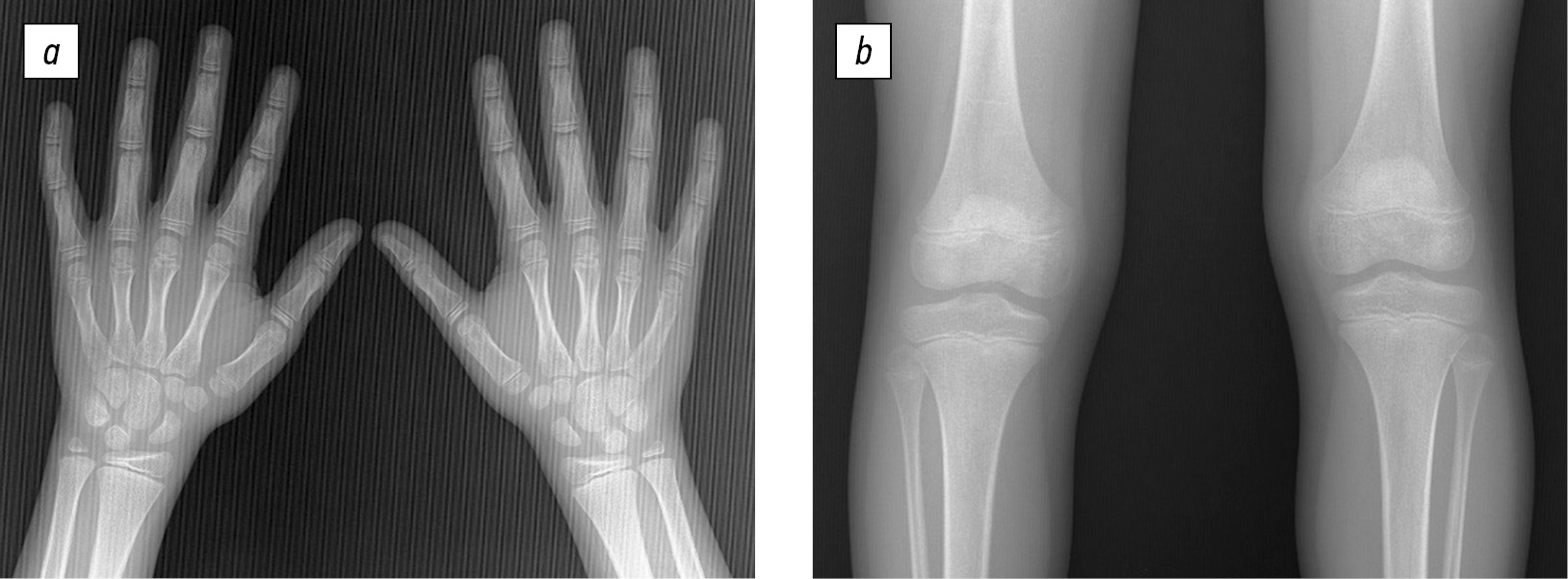 Radiographs of the hands and knee joints without significant changes (Fig. 3).