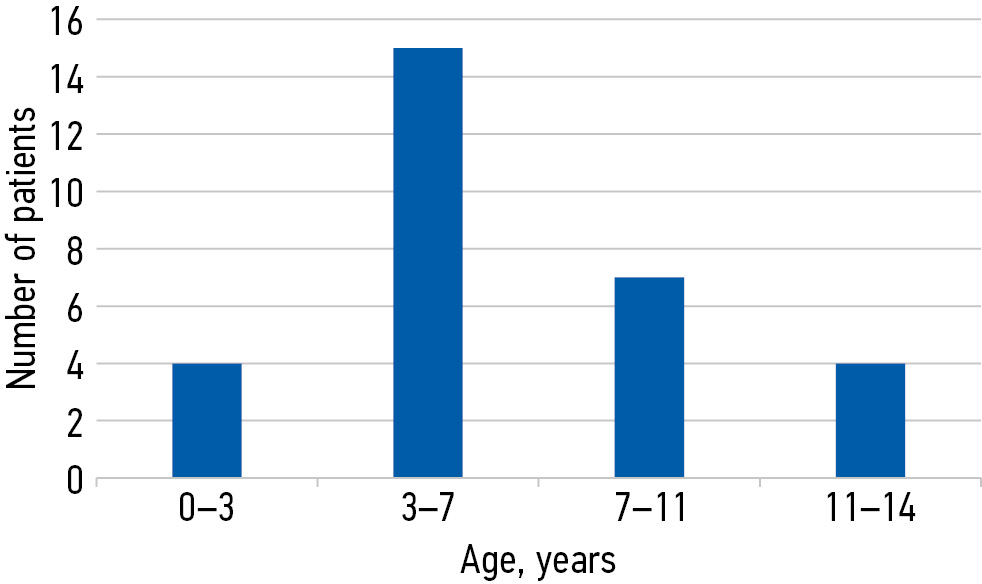 The study analyzed case histories, radiation imaging methods (multispiral computed tomography and digital radiography), and magnetic resonance imaging of 30 patients with congenital scoliosis of the thoracic spine, impaired segmentation of the lateral surfaces of the vertebral bodies, and unilateral synostosis of the ribs. There were 19 girls and 11 boys. The median age at the start of surgical treatment was 6 years, and the interquartile interval (IQR) was 4.25 (minimum, 12 months; maximum, 13 years). The patients were distributed by age based on N.P. Gundobin’s classification (Fig. 1).
