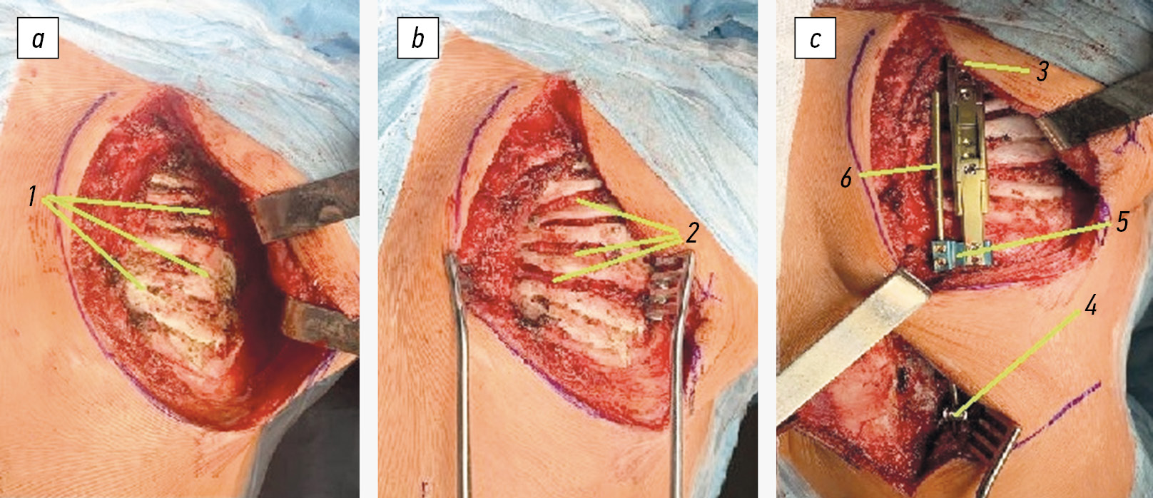 Fig. 2. Synostosis of the ribs (a). Appearance of the ribs after osteotomy of the synostosis of the ribs (b). Surgical intervention site after endoprosthesis replacement of the hardware and correction of the deformity (c): 1, zones of synostosis of the ribs; 2, osteotomy site; 3, area of the rib capture installation; 4, area of pedicle screw installation; 5, rib system connector; 6, length of the rod required to perform staged surgical interventions