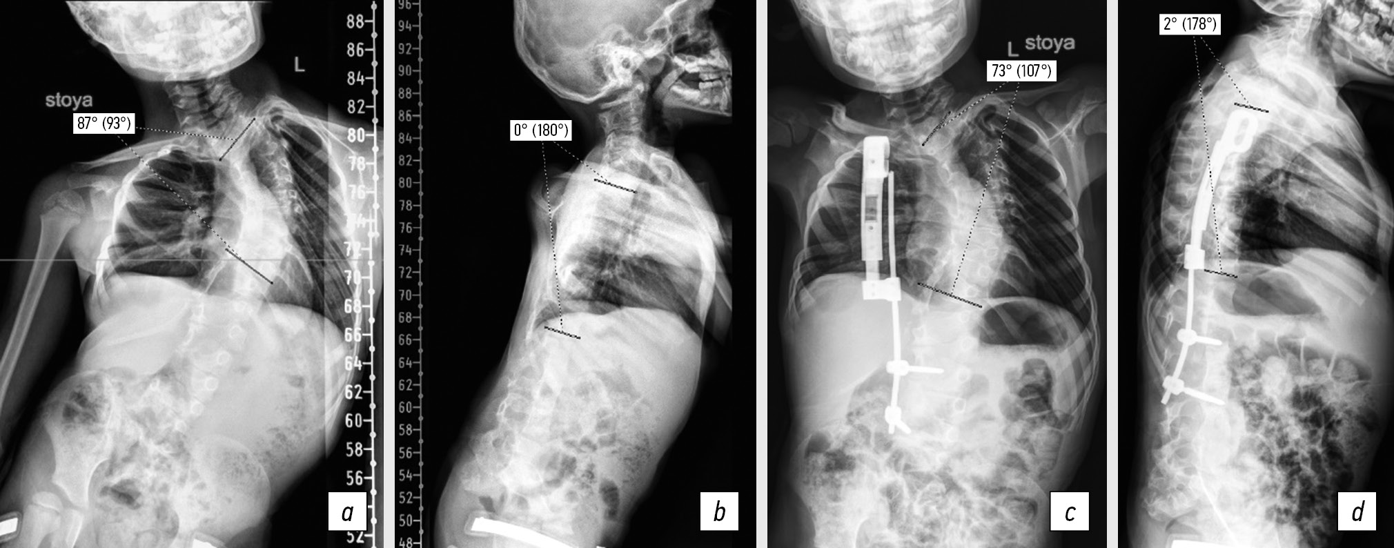 Fig. 3. Panoramic radiograph of the spine in frontal and lateral projections before and after the surgical treatment. Patient, 6 years old: a, b, scoliosis before the surgery (87°), lordosis of the thoracic spine (0°); c, d, scoliosis after the surgery (73°), kyphosis (2°)