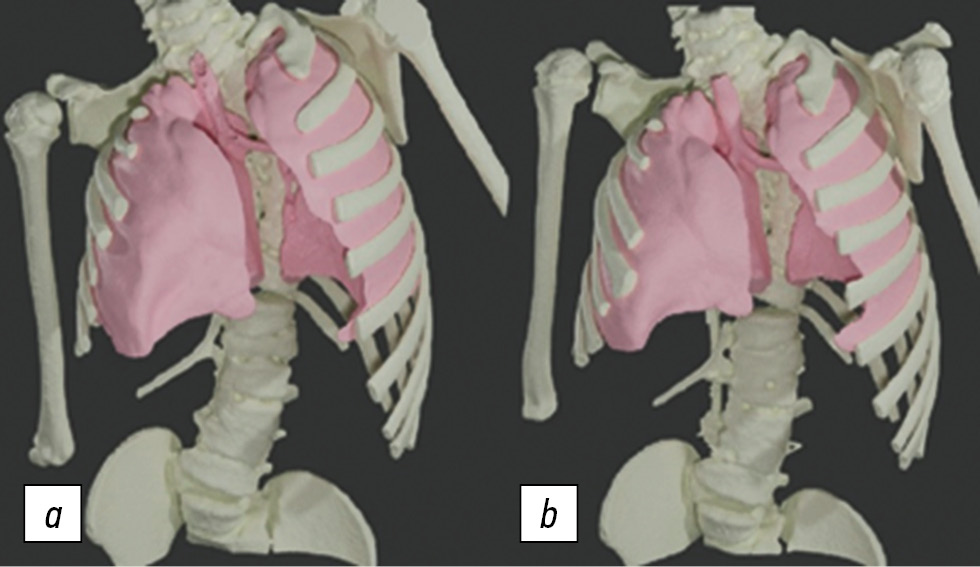 Fig. 4. CT volumetry. Patient, 6 years old: a, the lungs before the surgery; b, appearance 6 months after the surgery: a change in the spatial position of the shoulder girdle, an increase in the hemithoracic volume on the concave side, and an increase in the right lung by 72.8 cm3 (22.6%) and the left lung by 62.3 cm3 (20.7%). The total lung volume 6 months after the surgery increased by 21.7% (135.1 cm3)