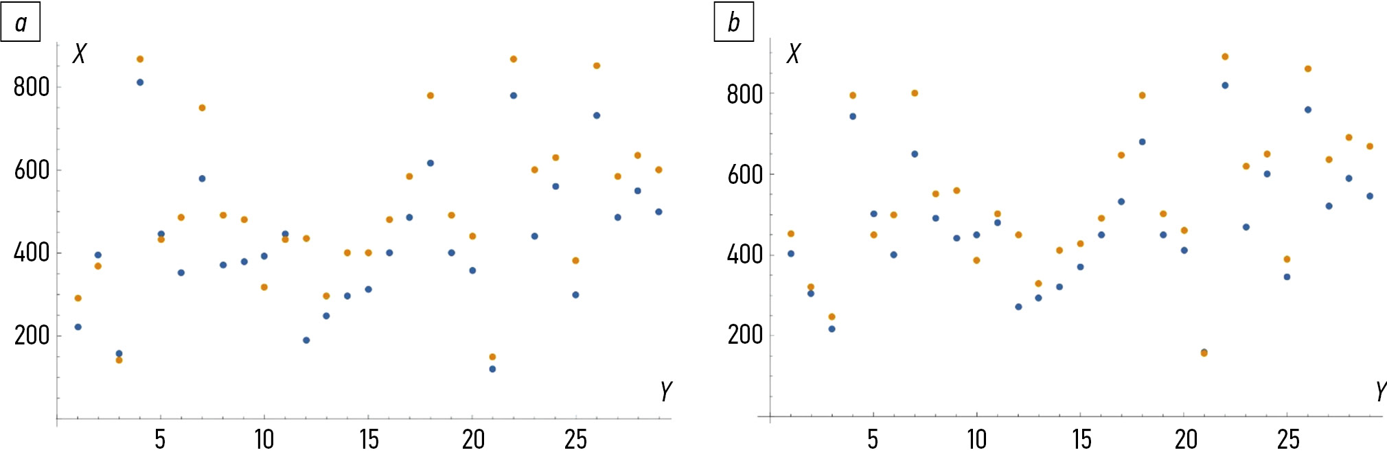 Fig. 5. Correlation of the volumes of the right and left lungs before and after the surgery: a, volumes before the surgery; b, volumes after the surgery. X is the volume cm3, Y is the serial number of the patient, yellow indicates the healthy side, and blue indicates the volume on the costal synostosis side. Before the surgery, the lung volume on the concave side was less than that on the convex side