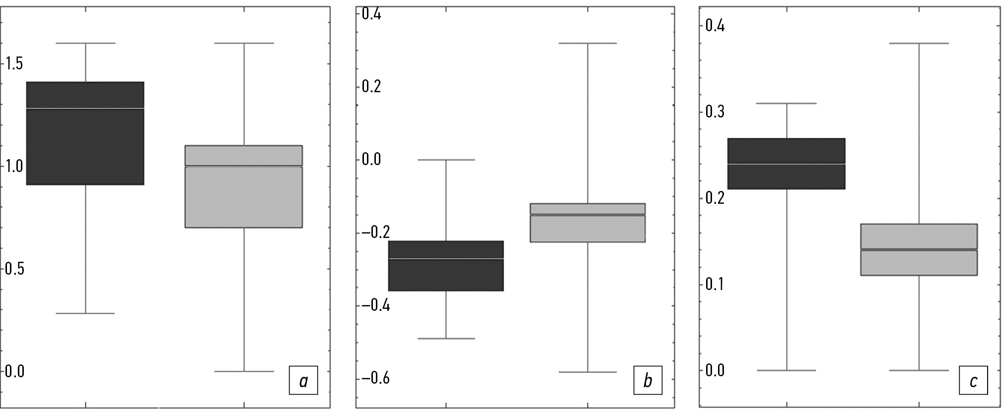 Statistical analysis was performed using the Wolfram Mathematica 11.0 program. The normality of distribution was tested using the Shapiro–Wilk test. For all parameters, the level of two-sided significance was p > 0.05, which indicates the impossibility of applying the normal distribution criteria. Median values and quartile intervals were calculated. The statistical significance of differences was assessed using the Wilcoxon signed-rank test.