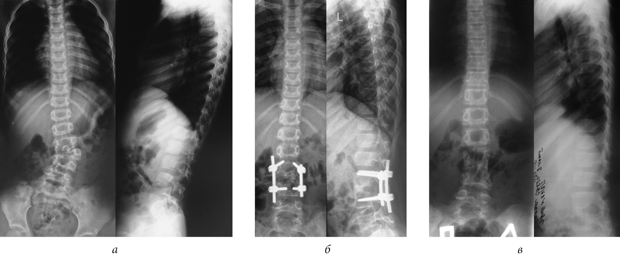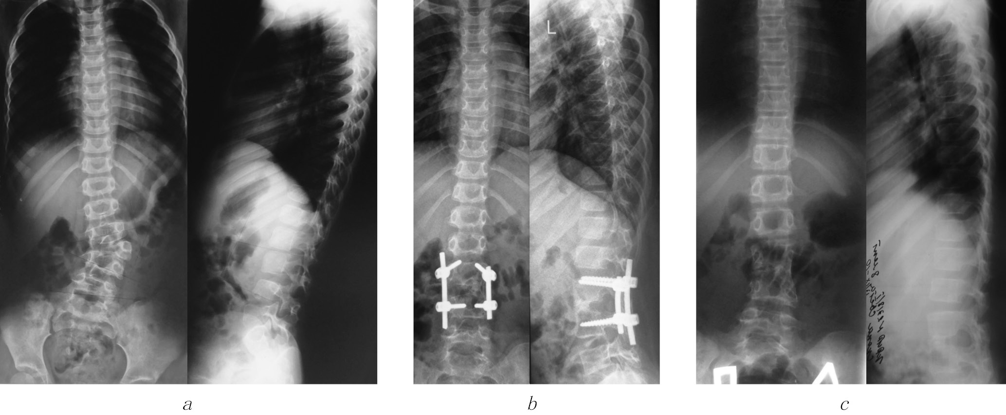 Radiographs of patient K., 1 year and 3 months, with congenital kyphoscoliosis with posterolateral semivertebra: (a) before surgery, the scoliosis angle is 26°, and the kyphosis angle is 12°; (b) 1.5 years after the surgery from a combined approach; and (c) 6 years after removal of surgical hardware