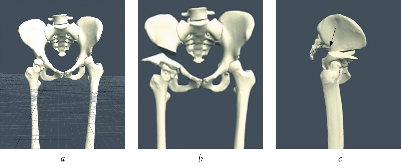 Fig. 1. Planning of the surgical intervention using the PME Planner program: a — segmentation of the image obtained after multislice CT; b — osteotomy of the pelvic bones and planning the correction of the acetabular position; c — planning the necessary translation of the posterior acetabular fragment