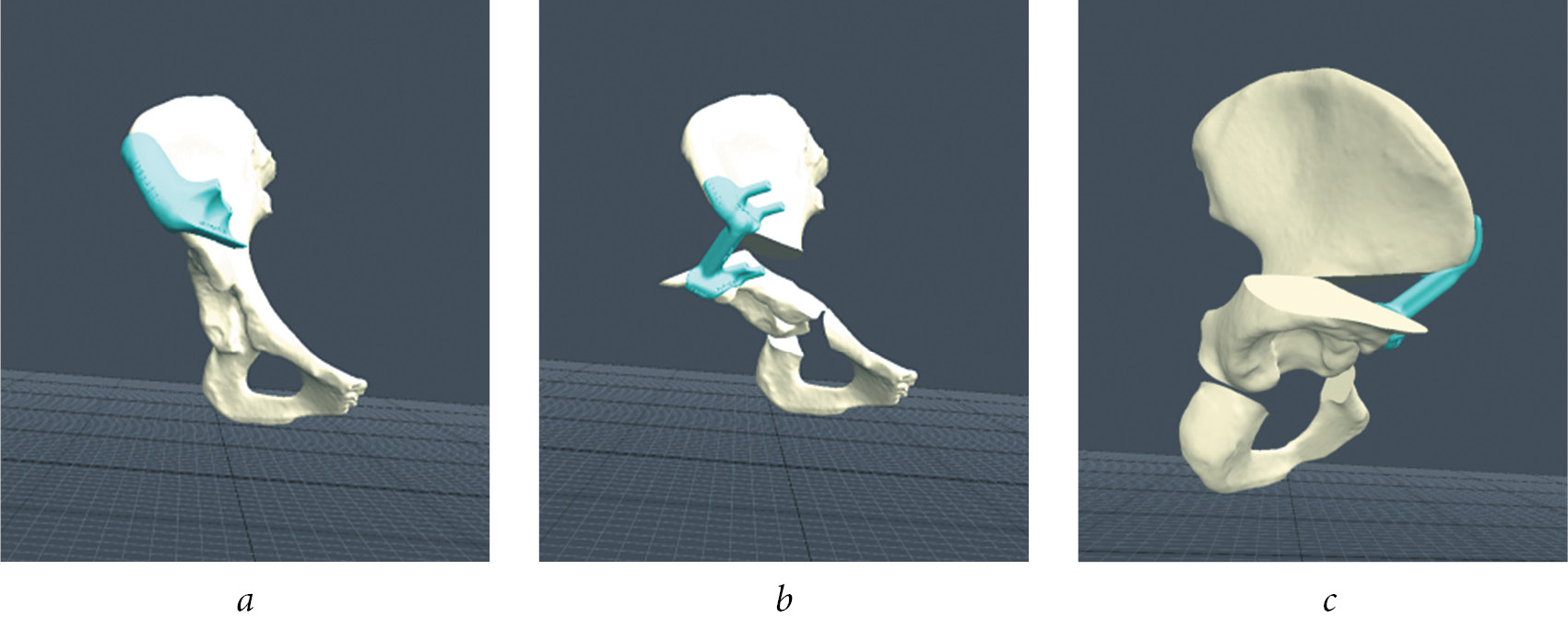 Fig. 2. Virtual creation of personalized navigation patterns in the PME Planner program: a — a template for performing the ilium body osteotomy; b, c — template for intraoperative fixation of the acetabular fragment in the position of the calculated correction in all planes