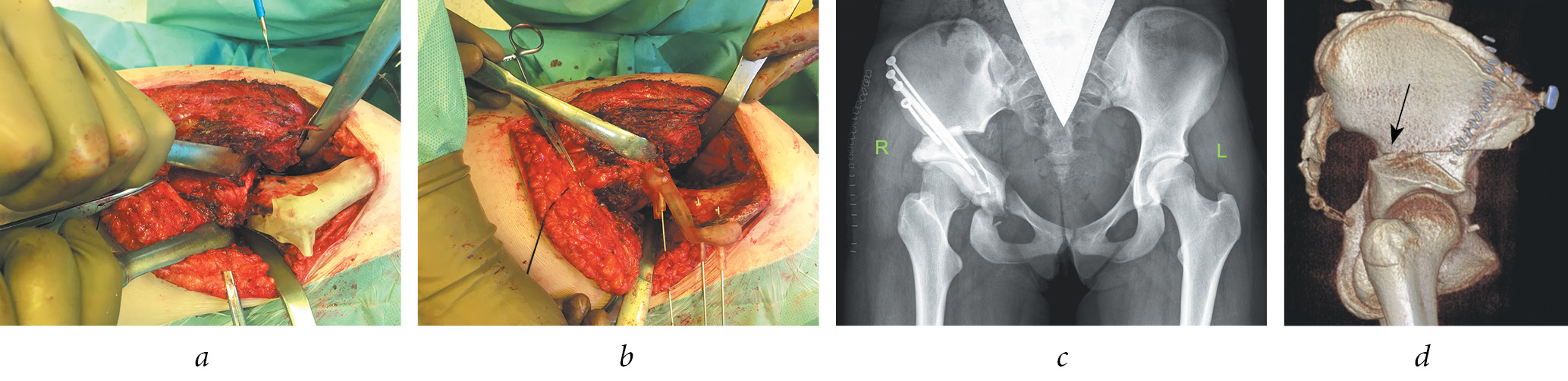 Fig. 3. Clinical application of a personalized navigation template: a — an intraoperative pattern for using a template to calculate the exact location of the ilium body osteotomy; b — intraoperative picture of using the template to fix the spatial position of the acetabulum in the position of the calculated correction; c, d — radiological and multislice CT result of triple pelvic osteotomy using the chosen technique