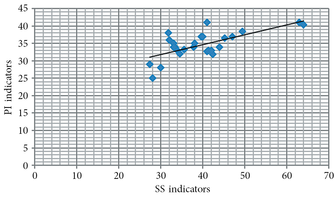 Fig. 4. Strong correlation between PI (pelvic incidence) and SS (sacral slope) values in the study group after treatment (r = 0.67; p < 0.05)