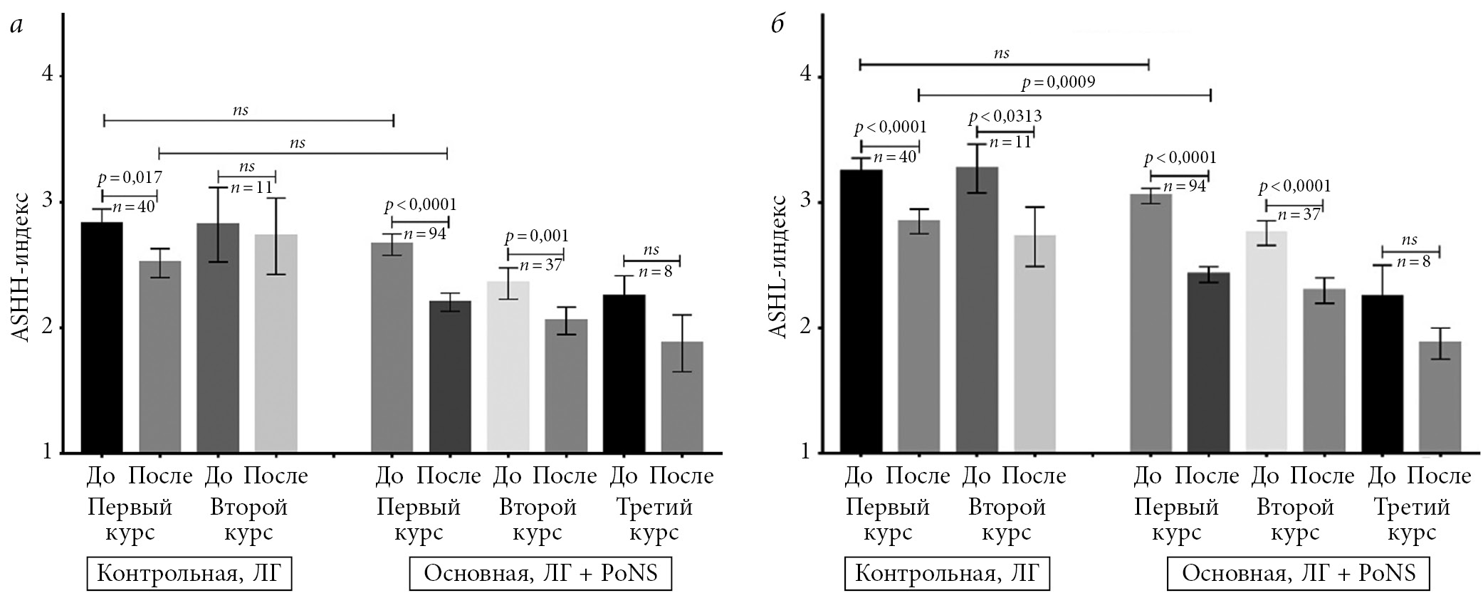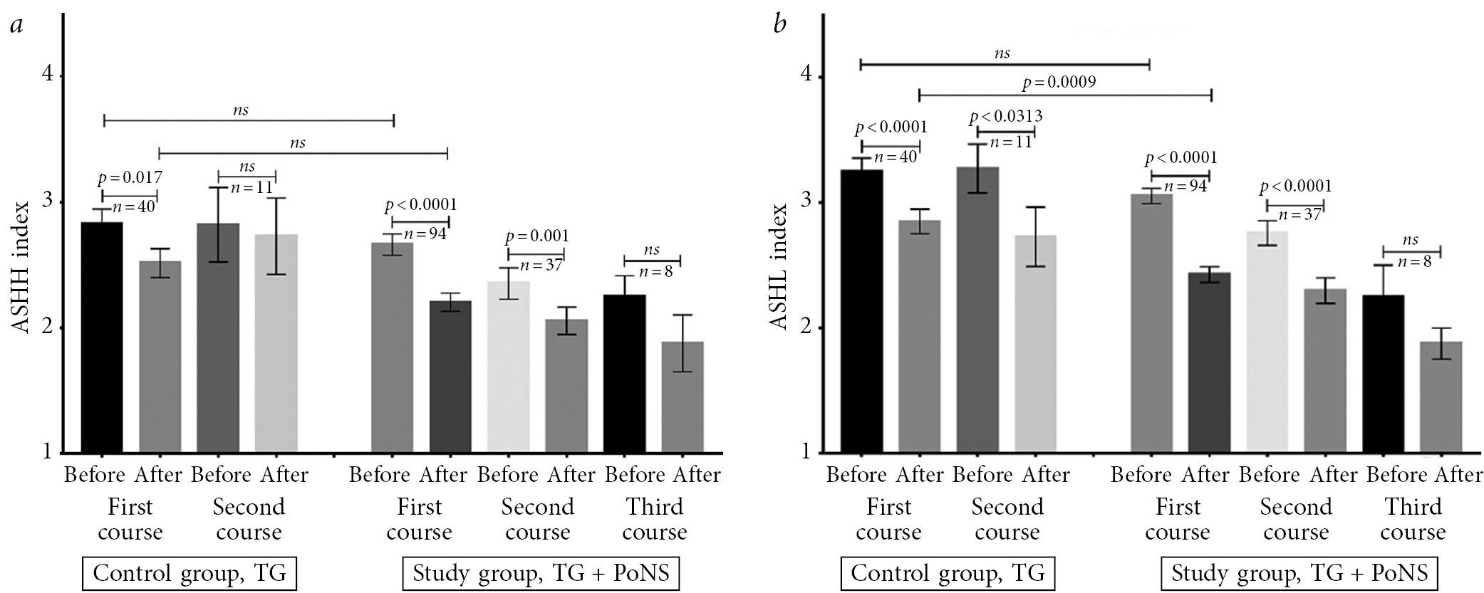 Fig. 2. The results of the Ashworth scale. a — spasticity of hands; b — spasticity of legs. TG — therapeutic gymnastics; PoNS — portable neurostimulator; ns — no statistically significant differences