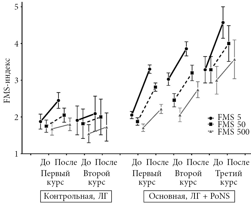 Fig. 3. The results of changes in motor activity according to the following scale of motor skills: FMS 5, 50, 500. TG — therapeutic gymnastics; PoNS — portable neurostimulator