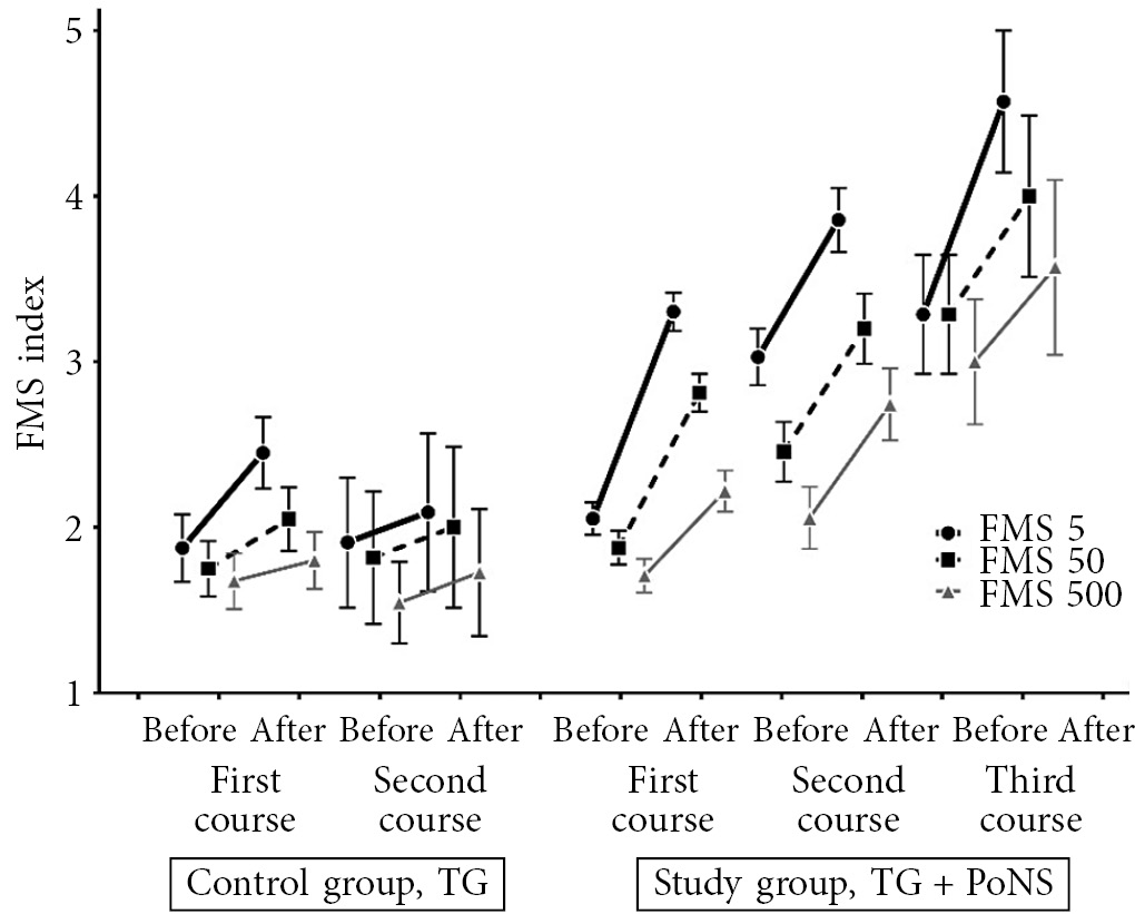 The second course was also effective and led to a significant improvement in motor skills on FMS 5 (+29%), FMS 50 (+30%), and FMS 500 (+31%) scales. After the third therapy course, the study group showed a continuous improvement in motor skills on FMS 5 (+40%), FMS 50 (+25%), and FMS 500 (+18%) scales. Despite the fact that the last two results were not statistically significant due to the small number of participants and the variability of the results, the overall positive trend in the improvement of motor skills when using neurostimulation was traced quite clearly (Fig. 3).