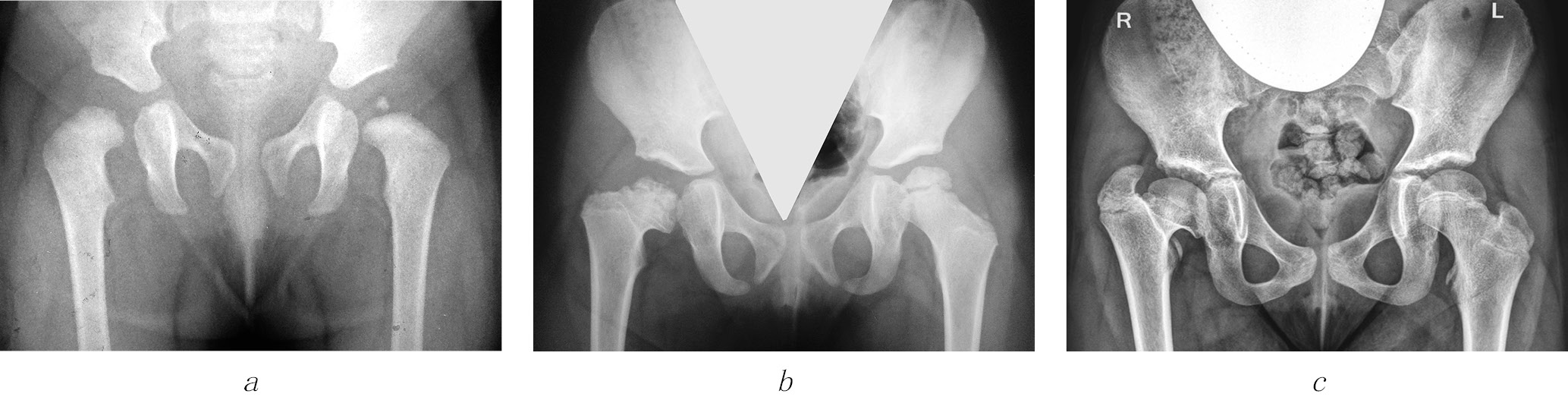 Рис. 3. Рентгенограммы пациентки Ш. Формирование многоплоскостной деформации проксимального отдела бедренной кости с высоким положением большого вертела после перенесенного аваскулярного некроза головки бедренной кости (справа — IV типа, слева — II типа по Kalamchi и MacEwen). В анамнезе — консервативное лечение по поводу врожденного вывиха бедра с двух сторон: а — в возрасте 1 года 2 месяцев; б — в возрасте 3 лет 9 месяцев; в — в возрасте 11 лет