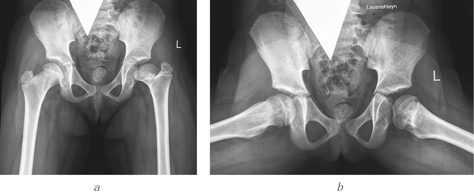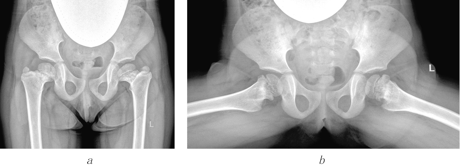 Рис. 5. Рентгенограммы пациентки Г., 4 года. Формирующееся высокое положение большого вертела с двух сторон, дистрофические изменения шейки бедренной кости. Случайная находка на рентгенограмме, выполненной в 3 года в связи с проявлениями транзиторного синовита тазобедренных суставов после перенесенной острой респираторной вирусной инфекции: а — прямая проекция; б — проекция по Лауэнштейну