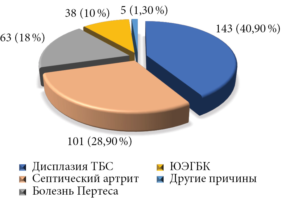 Рис. 2. Распределение исследуемых пациентов по нозологическим формам. ТБС — тазобедренный сустав; ЮЭГБК — юношеский эпифизеолиз головки бедренной кости