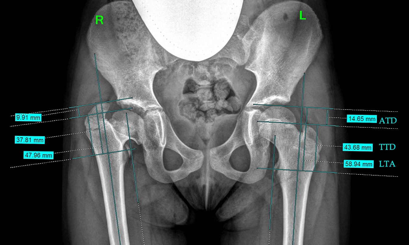 Рис. 6. Пример рентгенометрического анализа показателей, характеризующих изменения положения большого вертела относительно головки и шейки бедра. ATD — артикуло-трохантерная дистанция; TTD — межвертельное расстояние; LTA — расстояние от малого вертела до верхнего полюса головки бедра