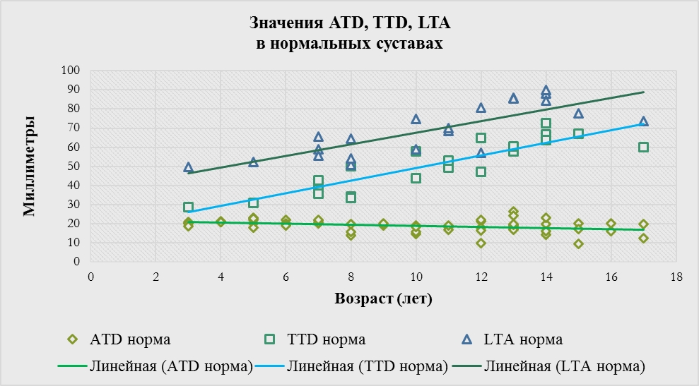 Рис. 10. Графики динамики показателя ATD в норме и при патологии в зависимости от возраста. ATD — артикуло-трохантерная дистанция