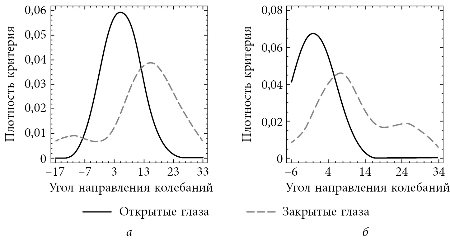 Fig. 3. Density curve of the angle values of the preferred direction of pressure center oscillations on the statokinesiograms of patients with unilateral shortening of the lower extremities: a — with congenital shortening of the lower extremity; b — with acquired shortening of the lower extremity