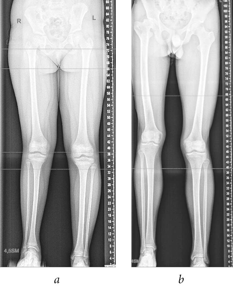 Fig. 1. Panoramic radiographs of the lower extremities: a — patient K., 10 years old, with congenital shortening of the right lower extremity by 4.5 cm; b — patient A., 16 years old, with acquired shortening of the right lower extremity by 4.0 cm