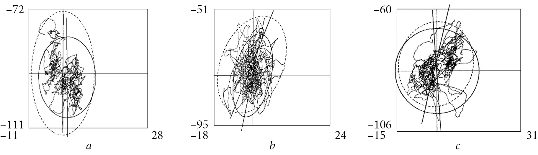 Fig. 2. Signs of the angle of the preferred direction of the pressure center oscillations on the statokinesiograms: a — нealthy child B., 10 years old, with a symmetrical load on the lower extremities; b — patient N., 12 years old, with congenital shortening of the left lower extremity; c — patient T., 13 years old, with acquired shortening of the left lower extremity. The long axis of the ellipse is the direction of oscillation, clockwise relative to the sagittal plane is a positive angle, and counterclockwise is a negative angle. The solid line is with eyes open and the dotted line is with eyes closed