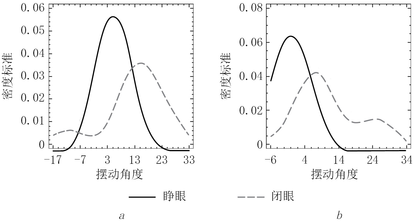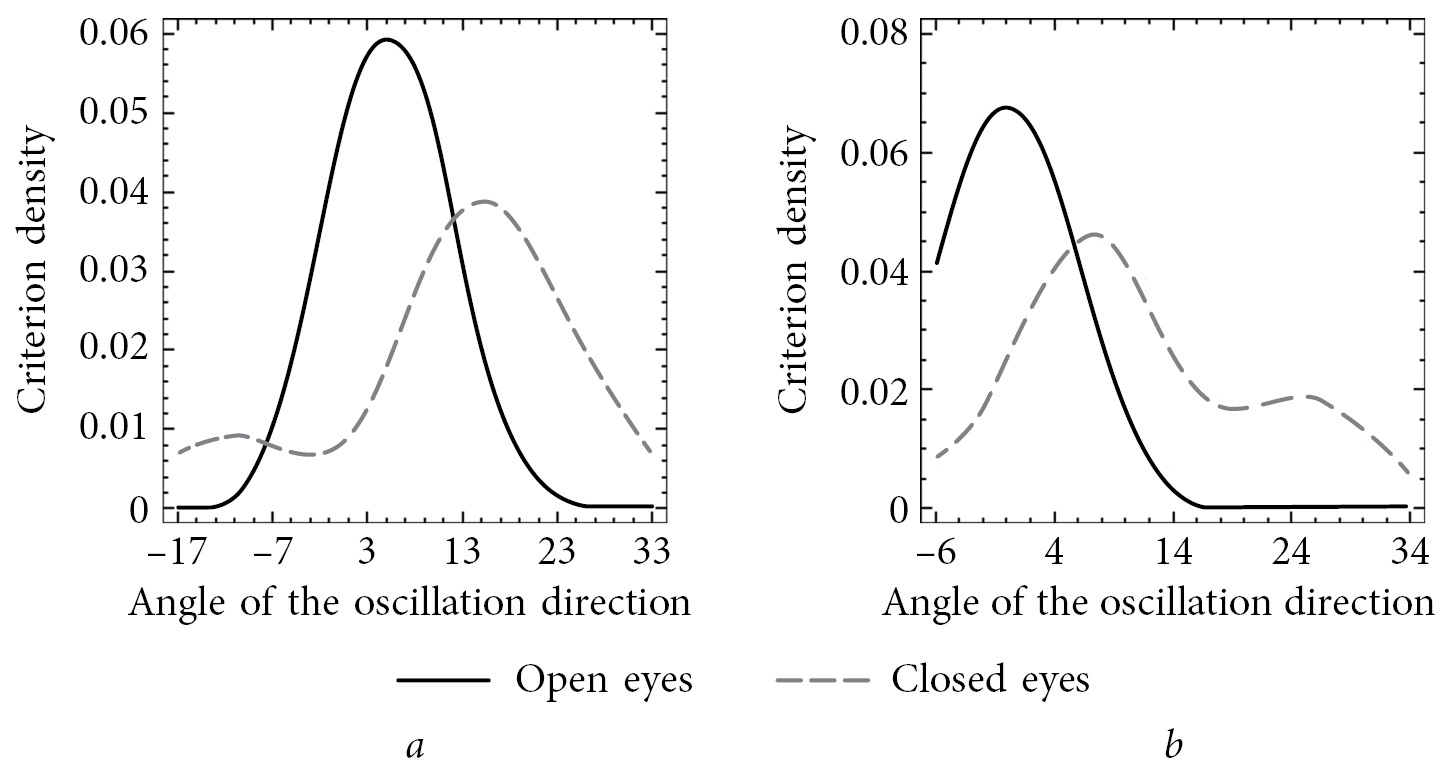 Regardless of the sign of the oscillation direction in both groups, the value of the angle module, Al, was greater with closed eyes than with eyes open (Fig. 3, a and b), which may indicate a decrease in postural stability without visual afference.