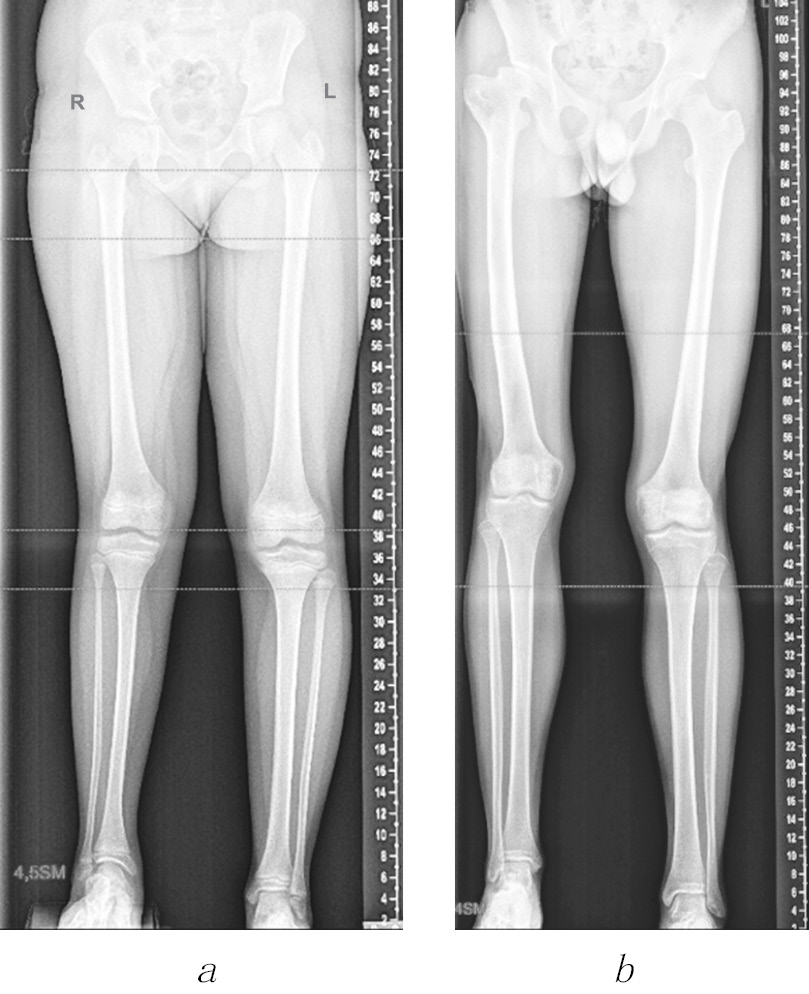 2. Fig. 1. Panoramic radiographs of the lower extremities: a — patient K., 10 years old, with congenital shortening of the right lower extremity by 4.5 cm; b — patient A., 16 years old, with acquired shortening of the right lower extremity by 4.0 cm