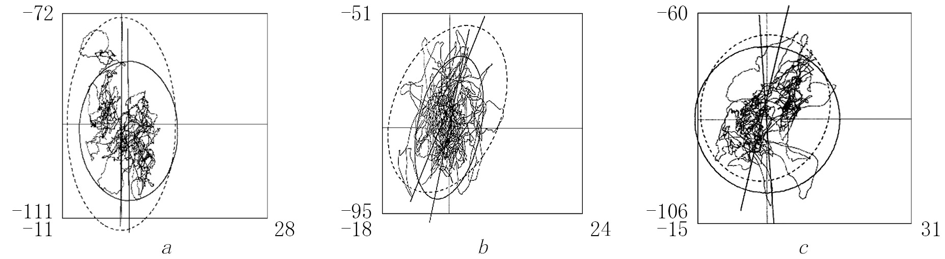 3. Fig. 2. Signs of the angle of the preferred direction of the pressure center oscillations on the statokinesiograms: a — нealthy child B., 10 years old, with a symmetrical load on the lower extremities; b — patient N., 12 years old, with congenital shortening of the left lower extremity; c — patient T., 13 years old, with acquired shortening of the left lower extremity. The long axis of the ellipse is the direction of oscillation, clockwise relative to the sagittal plane is a positive angle, and counterclockwise is a negative angle. The solid line is with eyes open and the dotted line is with eyes closed