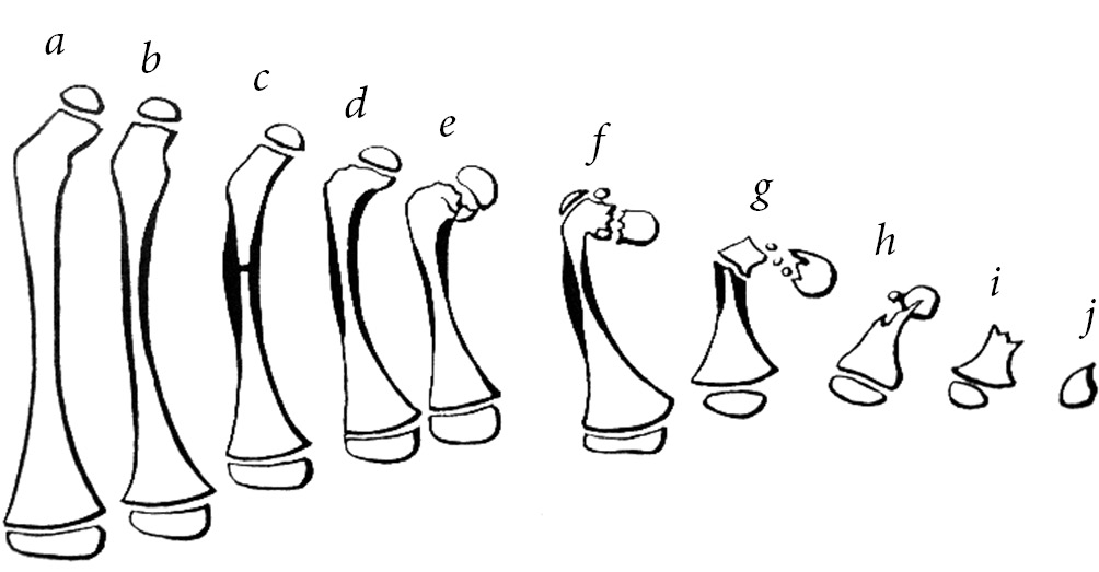 Another classification was developed by Henkel and Willert (1969). The authors described a teratological series of dysmelia, which included five types, namely, distal, axial, and proximal forms of ectromelia, phocomelia, and amelia. Each of the first three types was divided into short, intermediate, and long subtypes. In the distal form, there is damage to the foot and tibia; in the axial form, there is also damage to the femur, but the fibular bone remains intact; the proximal form is characterized by varying degrees of damage to the femur only [10].