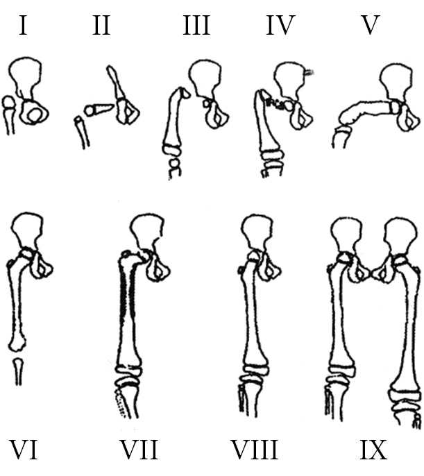 Hamanishi (1980) proposed a classification of five groups, each of which was divided into two subgroups, from hip hypoplasia with intact diaphysis to a completely absent or rudimentary hip with delayed ossification [16] (Fig. 2).