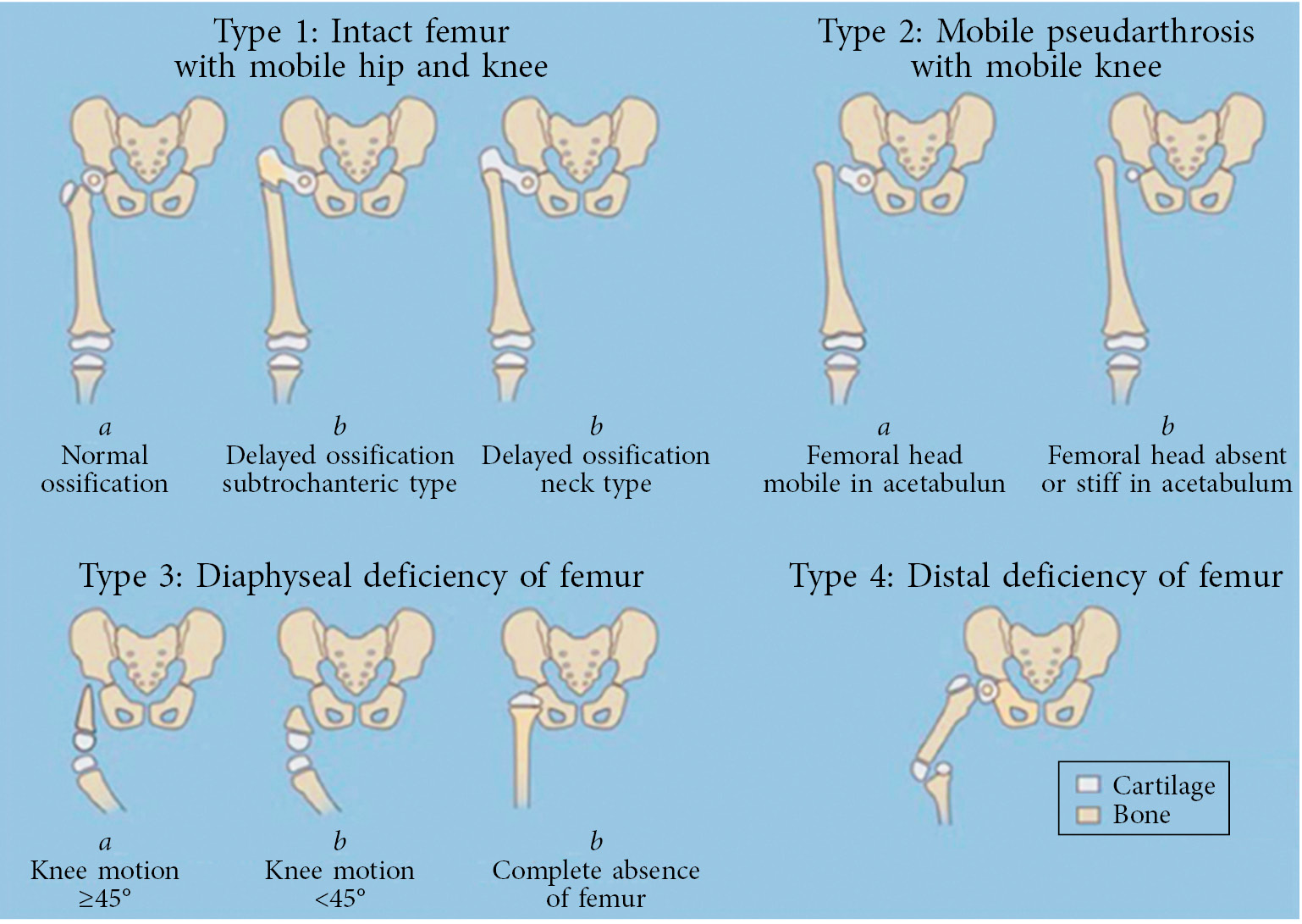 Type 1 shows that the femur is intact and there is a full range of movements in the hip and knee joints with normal ossification of the proximal femur (a) or with its delay (b).