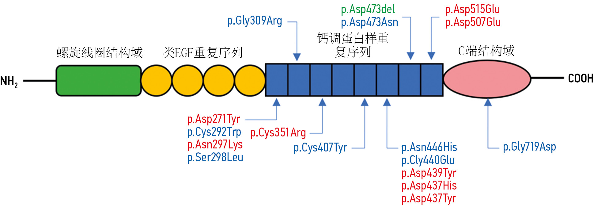 Fig. 6. Domain-specific distribution of pathogenic variants in COMP. Newly identified variants in COMP are highlighted in red, previously described variants are highlighted in blue, and frequent mutations are highlighted in green