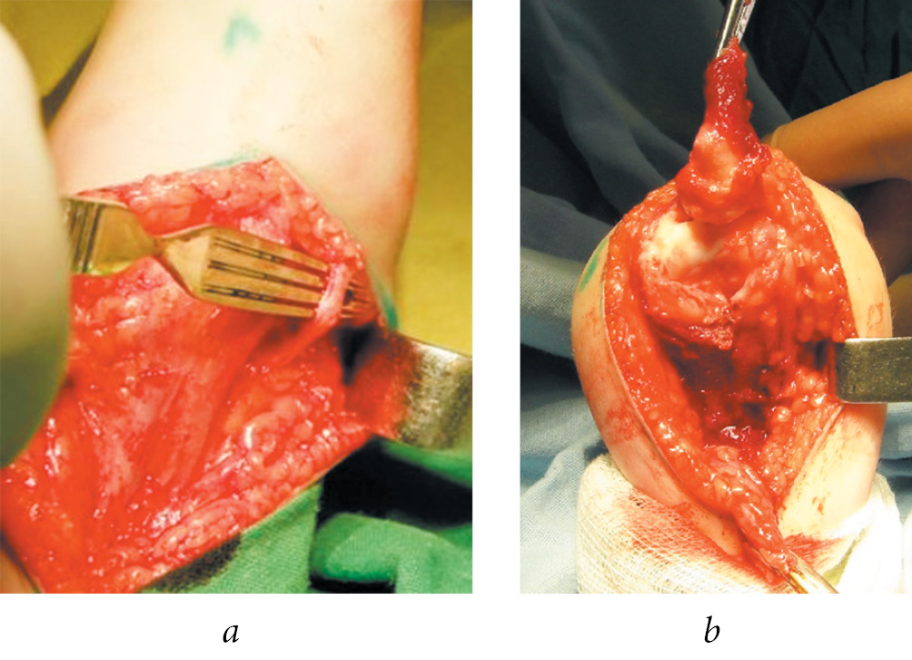 Fig. 1. Stages of posterior arthrolysis of the elbow joint: a — mobilization of the ulnar nerve; b — elongation of the tendon of the triceps muscle and capsulotomy of the elbow joint at the posterior surface