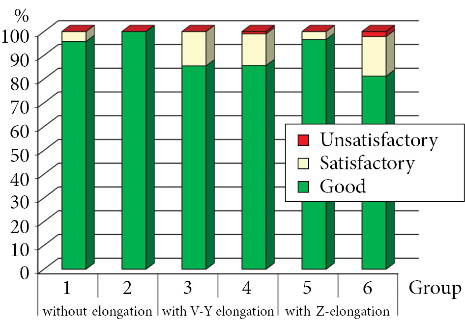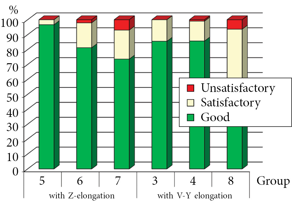 When comparing groups of patients who underwent Z-shaped and VY-elongation of the triceps muscle, the best results were seen in patients less than 3 years of age, with Z-elongation of the triceps muscle tendon. Additionally, good results were obtained in patients 1 year of age or less in 96.67%. In those from 1–3 years of age good, results were observed in 81.25% of cases. In patients 1 year of age or less with V-Y-elongation of the tendon of the triceps muscle, good results were observed in 85.56% of cases, and in those 1–3 years of good results were in 85.71% of cases. In patients 3 years of age or older with Z-elongation of the tendon of the triceps muscle, the percentage of good results decreased. Satisfactory results were 19.44% with Z-elongation and 36.51% with V-Y-elongation of the tendon of the triceps muscle. Unsatisfactory results in these groups were registered in 6.94 and 6.35% of cases, respectively. In patients over 7 years of age, good results were achieved in 75% of cases, satisfactory results were noted in 16.67% of cases, and unsatisfactory results were in 8.33% of cases. These results did not differ much from those of patients 3–7 years of age with elongation of the triceps muscle tendon (Fig. 3).
