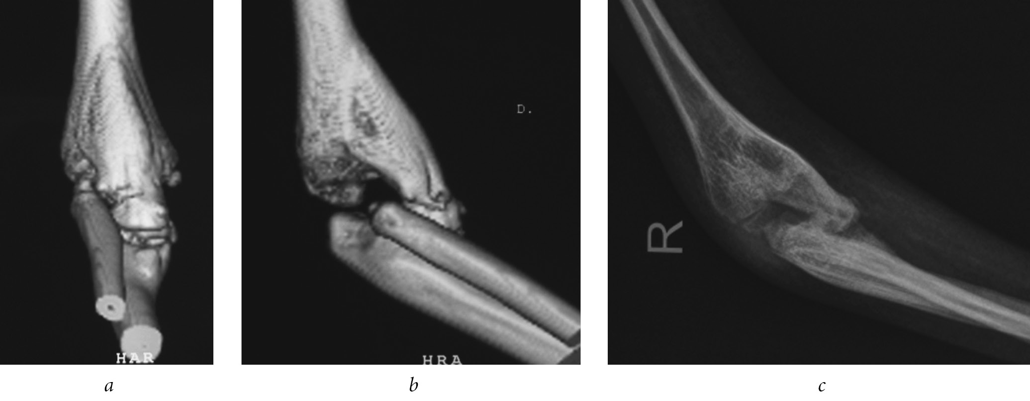 Fig. 4. Ossification of the elbow joint on the front surface of patient B., 5 years of age, after posterior arthrolysis of the elbow joint: a — computed tomography of the elbow joint, frontal view; b — computed tomography of the elbow joint, lateral view; c — a radiograohic image of an elbow joint in a lateral view