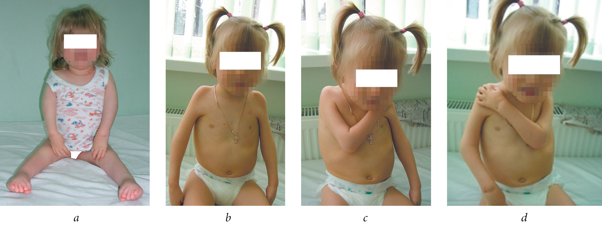 Fig. 6. Good result of treatment of the patient Ya., 4 years of age, after posterior release of the elbow joints with elongation of the triceps muscle at the age of 11 months: a — view before treatment (no passive flexion in the elbow joints); b — extension of the elbow joints after surgery; c, d — flexion of the elbow joints after surgical treatment