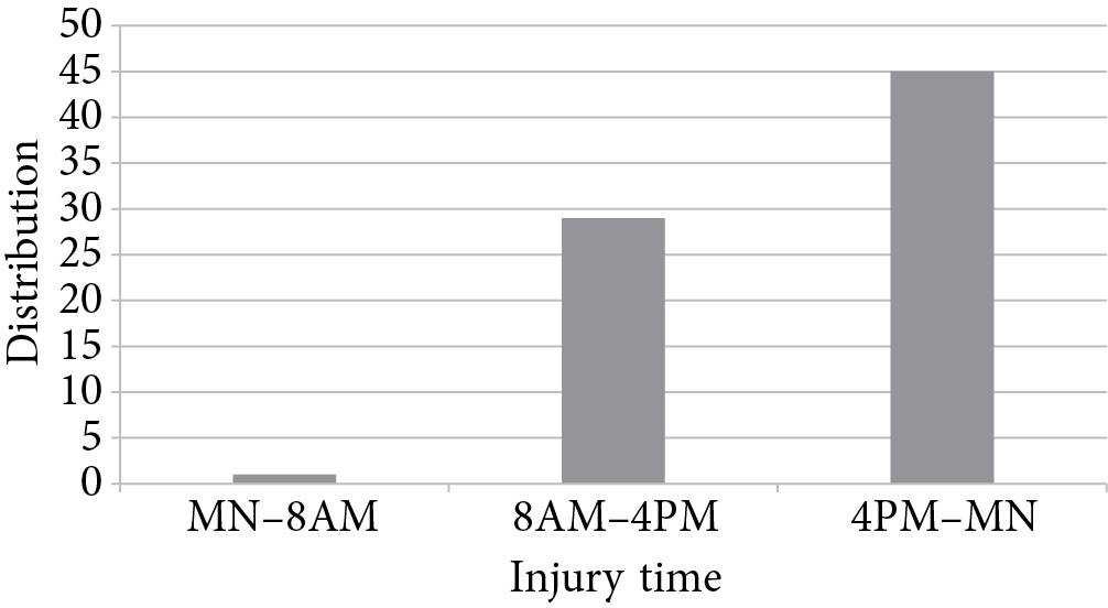 However, this study has significance in that the relationship between the timing of operation after injury and clinical results was investigated. As shown in this study, most injuries tend to occur in the afternoon, and when the injuries were treated within 24 hours, no statistically significant difference was found in the relationship between the timing of operation after injury and the duration of surgical procedure. Considering a majority of injuries tend to occur in the afternoon, surgical treatments are likely to be performed late at night or at dawn due to NPO. Unless there are issues, such as neurovascular symptoms, requiring immediate attention and emergency operation, performing surgical treatment of injuries during regular hours instead of late at night or at dawn should be positively considered so long as it is done within 24 hours of injury.
