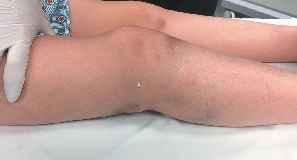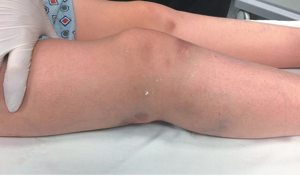 Девятилетняя девочка получила травму правой бедренной кости в результате падения во время катания на санках, когда она на небольшой скорости врезалась в вертикально стоящий столб на баскетбольной площадке. Пациентка поступила в отделение неотложной помощи с выраженной деформацией правого коленного сустава (рис. 1), жалобами на невозможность ходить и боли в правой нижней конечности.