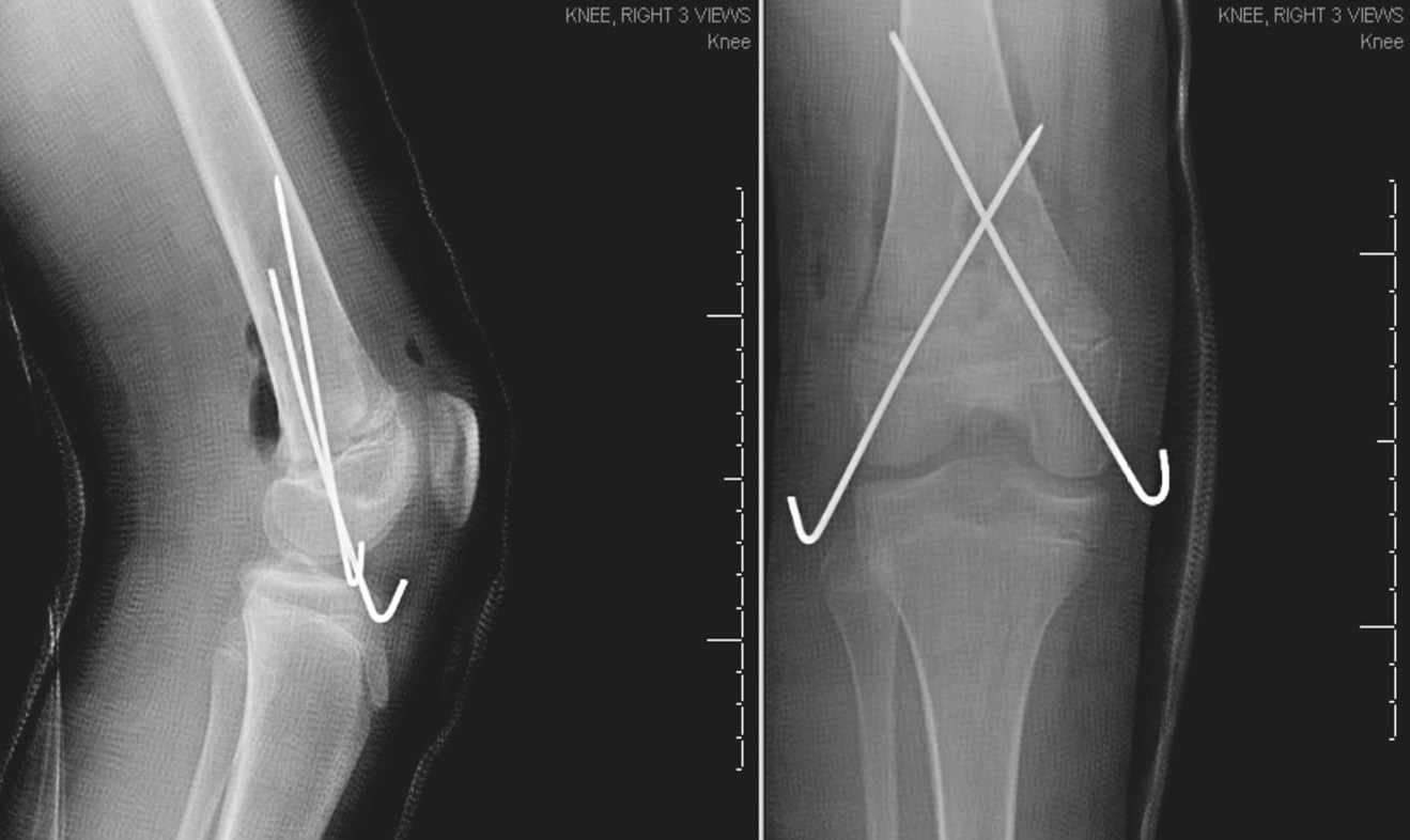 Рис. 3. Рентгенограмма правого коленного сустава в переднезадней и боковой проекциях после открытой репозиции и внутренней фиксации. Видна нормальная репозиция с фиксацией двумя спицами, перекрестно установленными через эпифиз