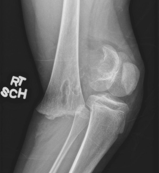 Рис. 2. Рентгенограмма правого коленного сустава в боковой проекции, показывающая перелом дистального отдела бедренной кости Салтер – Харриса 2-го типа со смещением