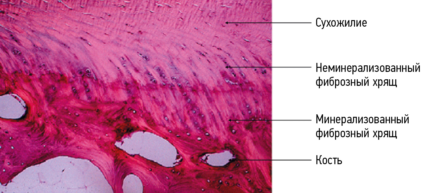 Enthesis can take the form of dense fibrous connective tissue (fibrous enthesis) or fibrous cartilage (fibrocartilagenous enthesis). Fibrous entheses occur at the site of the diaphyses of long bones and the spinal column, whereas fibrocartilagenous entheses are localized near the epiphyses of long bones and attach to short bones and some parts of the vertebrae. Fibrous enthesis is represented by mineralized collagen fibers that penetrate into the bone or periosteum, which is part of a wide site of the bone diaphysis (e.g., the junction of the deltoid muscle with the humerus). Fibrocartilagenous entheses consist of four zones (Fig. 1). Zone 1 is represented by a tendon or ligament that comprises type I and III collagen fibers, elastin, proteoglycans, and fibroblasts. Zone 1 passes into a non-mineralized fibrocartilagenous zone, consisting of type I, II, and III collagens, aggrecan, and chondrocytes. Zone 2 is the mechanical boundary between soft and hard tissues. Zone 3 is represented by mineralized fibrous cartilage, mainly composed of type II collagen with a small amount of aggrecan, type I and X collagens, and chondrocytes. The bone structure is zone 4 of enthesis [2, 3].