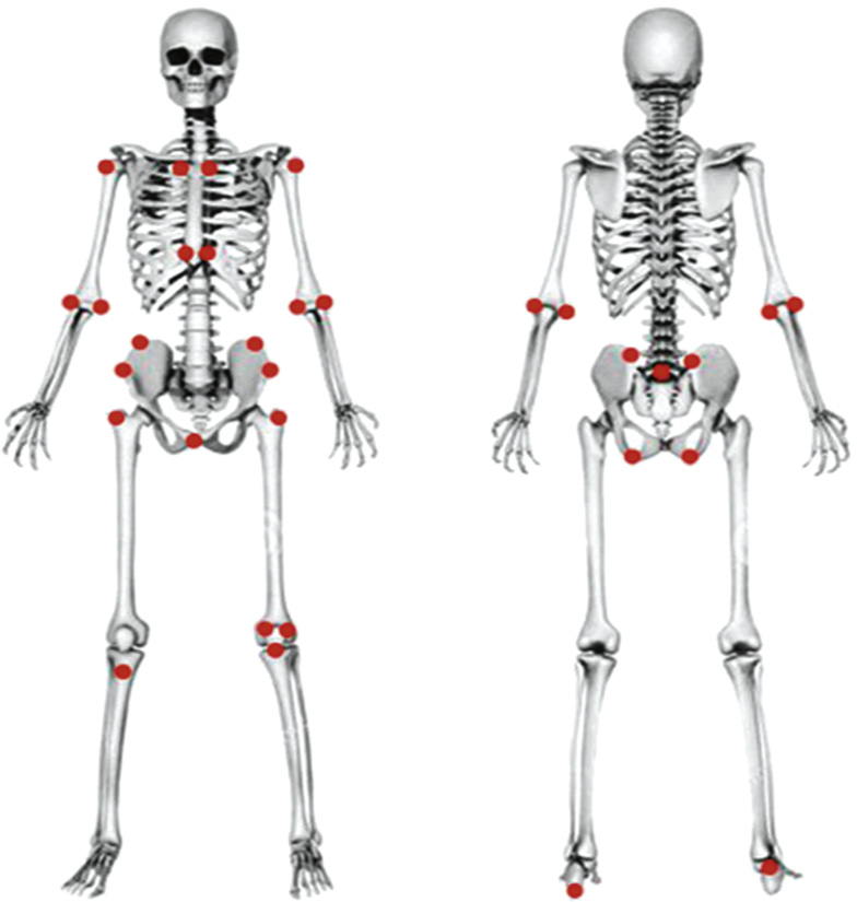 The onset of ERA is usually after the age of 6 years and more often affects boys than girls. The disease onset may be characterized by arthritis of the lower extremities, usually asymmetric, affecting less than five joints, with rare polyarticular lesions. In some cases, a lesion occurs in the form of edema of the intertarsal joints and bones, overlying tendons, and entheses and soft tissues (tarsitis), accompanied by pain and limitation of movement in the midfoot. Early hip joint involvement is characteristic, which is extremely rare in other JIA forms. In general, most pediatric patients also have signs of enthesitis. The attachment sites of the plantar fascia (heel bone, base of the metatarsal bone V, and metatarsal heads) and the Achilles tendon to the calcaneus are often the most painful on palpation. Other localizations of enthesitis include the upper and lower parts of the patella (at the 2, 6, and 10 o’clock positions), tibial tuberosity, greater trochanter, ischial tuberosity, anterior and superior iliac spines, iliac crest, sternal-clavicular joint, and ulnar joint epicondyles (Fig. 2) [13].