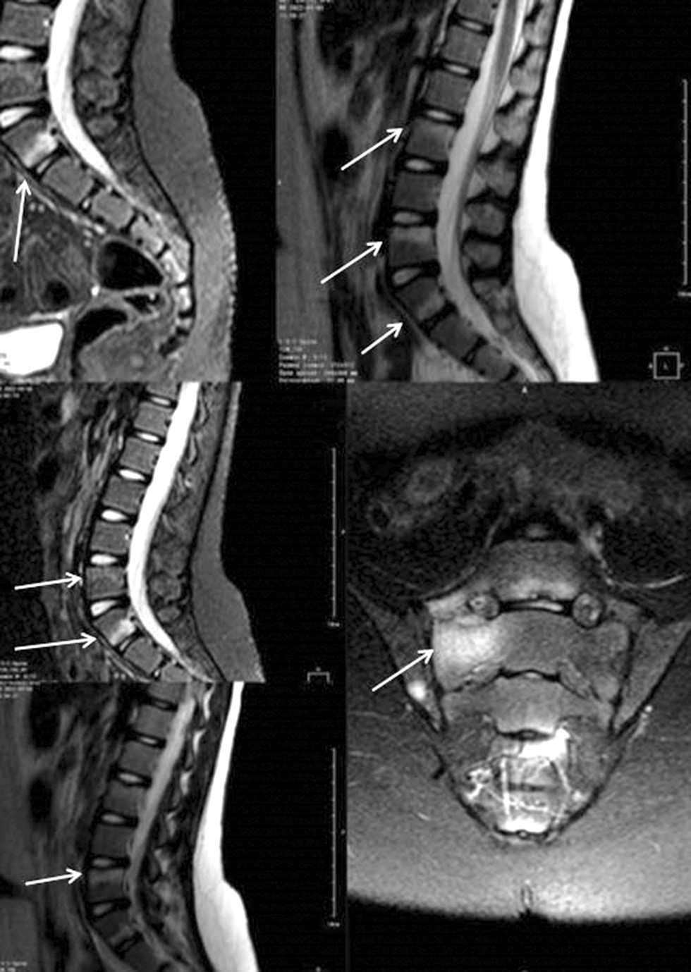 Fig. 5. Vertebral spondylodiscitis and sacroiliitis in a 9-year-old girl with enthesitis-related arthritis (magnetic resonance imaging, changes are indicated with arrows)
