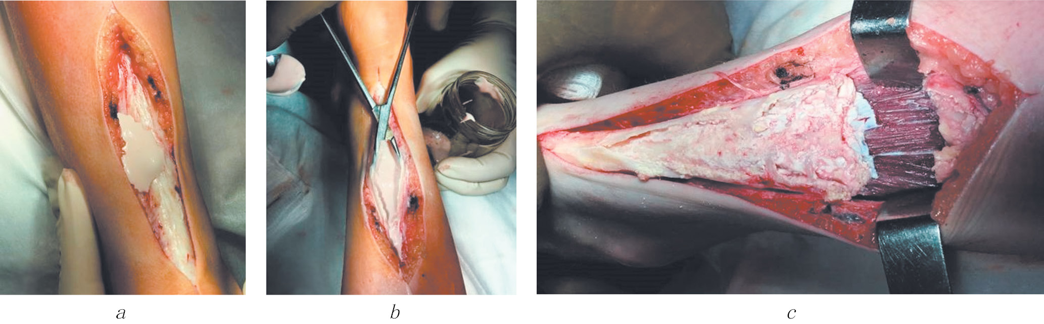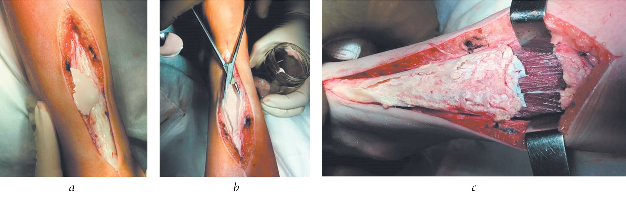 Рис. 2. Интраоперационные изменения у пациента с туморальным кальцинозом: а — вид интраоперационной раны в момент самопроизвольного вскрытия стенки конгломерата тканей в области ахиллова сухожилия; б — вскрыта (заполнена жидким белесым содержимым) полость в ахилловом сухожилии; в — вид интраоперационной раны после миопластики. Определяются неизмененные волокна икроножной мышцы