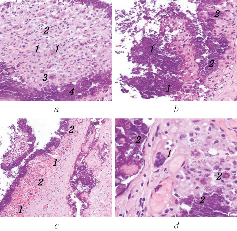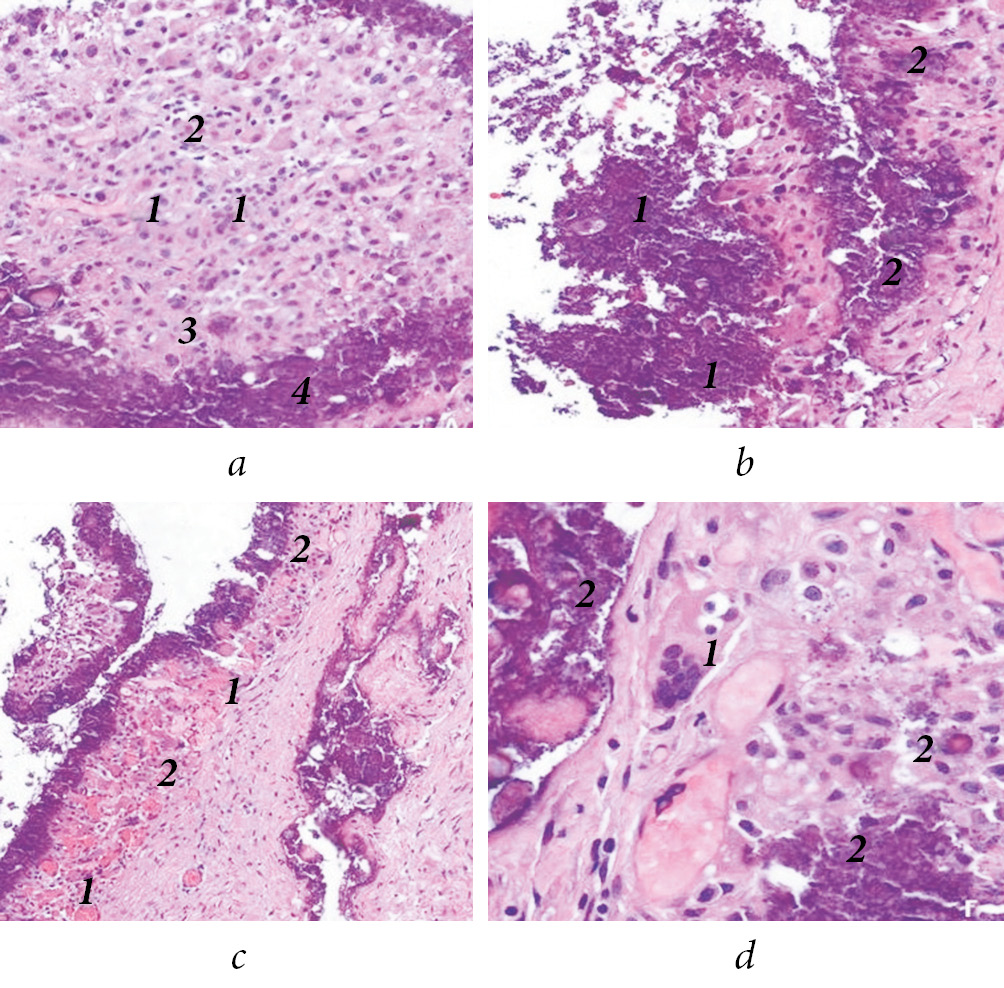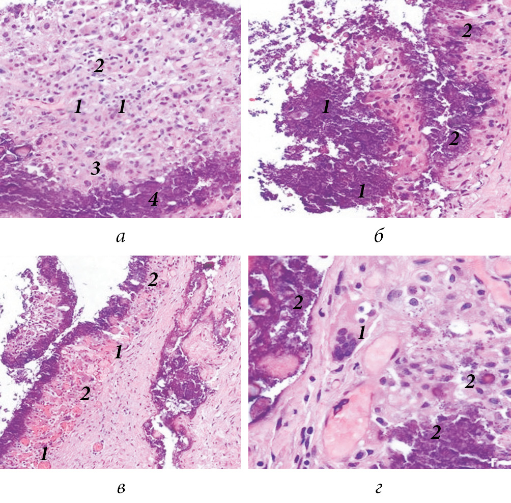 Рис. 3. Гистологические изменения у пациента с первичным туморальным кальцинозом: а — окраска гематоксилином и эозином. ×200. Воспалительный инфильтрат: 1 — лимфоцитарно-плазмоцитарная инфильтрация; 2 — пенистые клетки — макрофаги; 3 — гигантские многоядерные клетки инородных тел; 4 — соли кальция; б — окраска гематоксилином и эозином. ×200. Стенка кисты с большим количеством кальция в стенке (1) и в просвете (2); в — окраска гематоксилином и эозином. ×100. Стенка кисты с кальцием. В стенке кисты: 1 — многочисленные полнокровные сосуды; 2 — лимфоцитарно-плазмоцитарная инфильтрация; г — окраска гематоксилином и эозином. ×400. Стенка кисты: 1 — гигантские многоядерные клетки инородных тел; 2 — кальций
