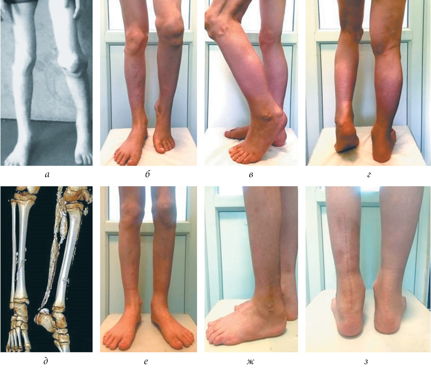 Рис. 1. Динамика изменений пациента с туморальным кальцинозом до и после оперативного лечения: а — внешний вид пациента в возрасте 7 лет (2013). Определяются кальцинаты в области коленных суставов, эквинусная деформация левой стопы; б–г — внешний вид пациента в возрасте 11,5 года (2017). Определяются множественные кальцинаты в области коленных и голеностопных суставов, эквинусная деформация левой стопы; д — мультиспиральная компьютерная томография голеней, выполненная в 2017 г. Определяются множественные кальцинаты мягких тканей голеней, больше слева, кальцифицированное ахиллово сухожилие и частично кальцифицированная икроножная мышца; е–з — внешний вид пациента через 3 мес. после оперативного лечения. Устранена эквинусная деформация левой стопы. Новые кальцинаты не визуализируются
