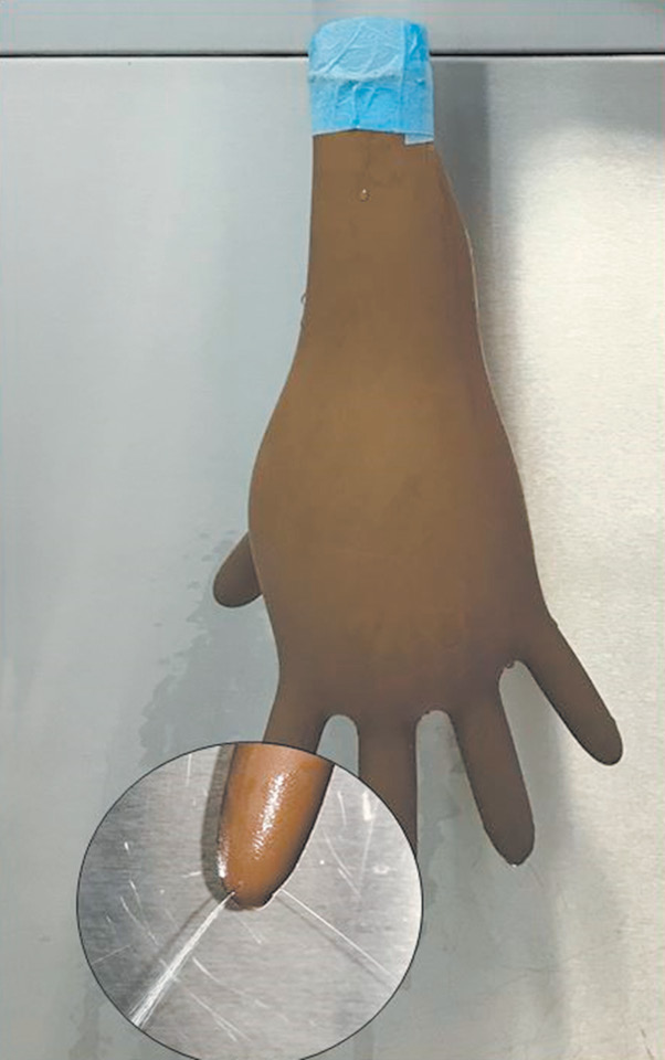 After each surgery, surgical gloves were examined for perforations and ruptures according to a previously described standard method [17]. Briefly, the gloves were filled with one liter of water at room temperature, and checked for defects for two min by manually pressing each finger and the interdigital spaces of the glove (Fig. 1).