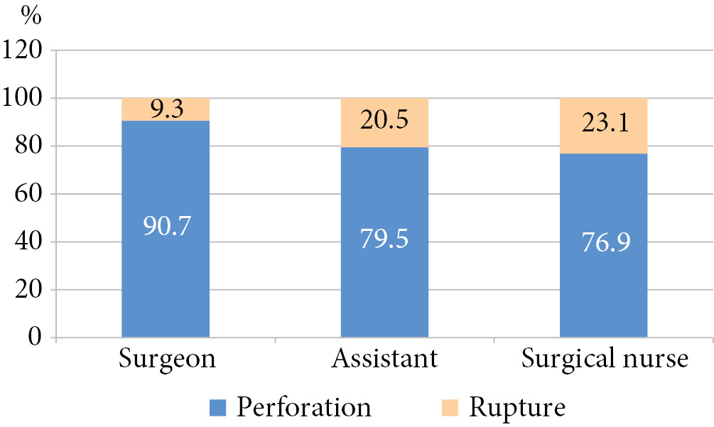 Of the 50 surgical interventions during which the surgeon independently sutured the wound, 15 (i.e., 30%) involved damage to surgical gloves with perforation in 13 cases (86.7%) and rupture in two cases (i.e., 13.3%). Of the 104 surgeries involving wound suturing by an assistant, 24 (i.e., 23%) were accompanied by glove damage, with 18 cases (75%) of perforation and 6 cases (25%) of rupture.